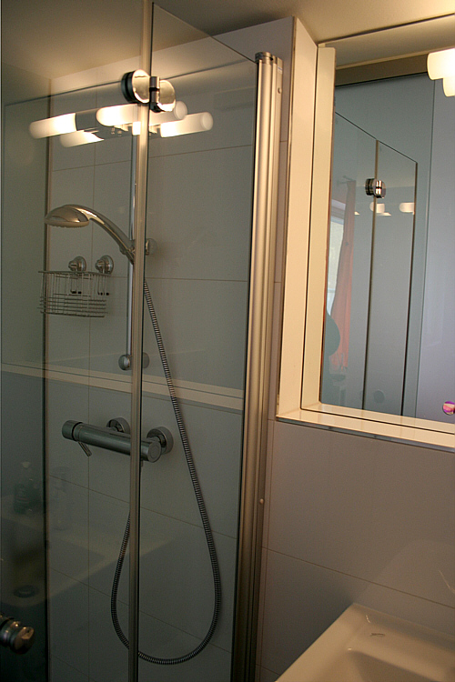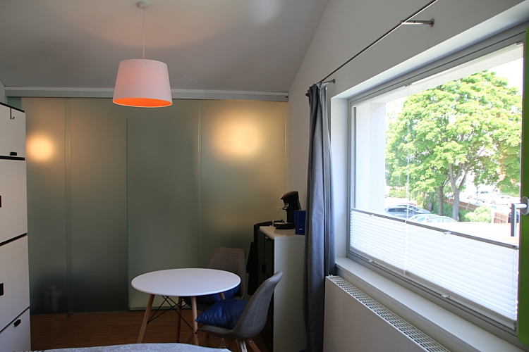 sowie Kühlschrank, Kaffeemaschine, Wasserkocher und entsprechendes Geschirr.